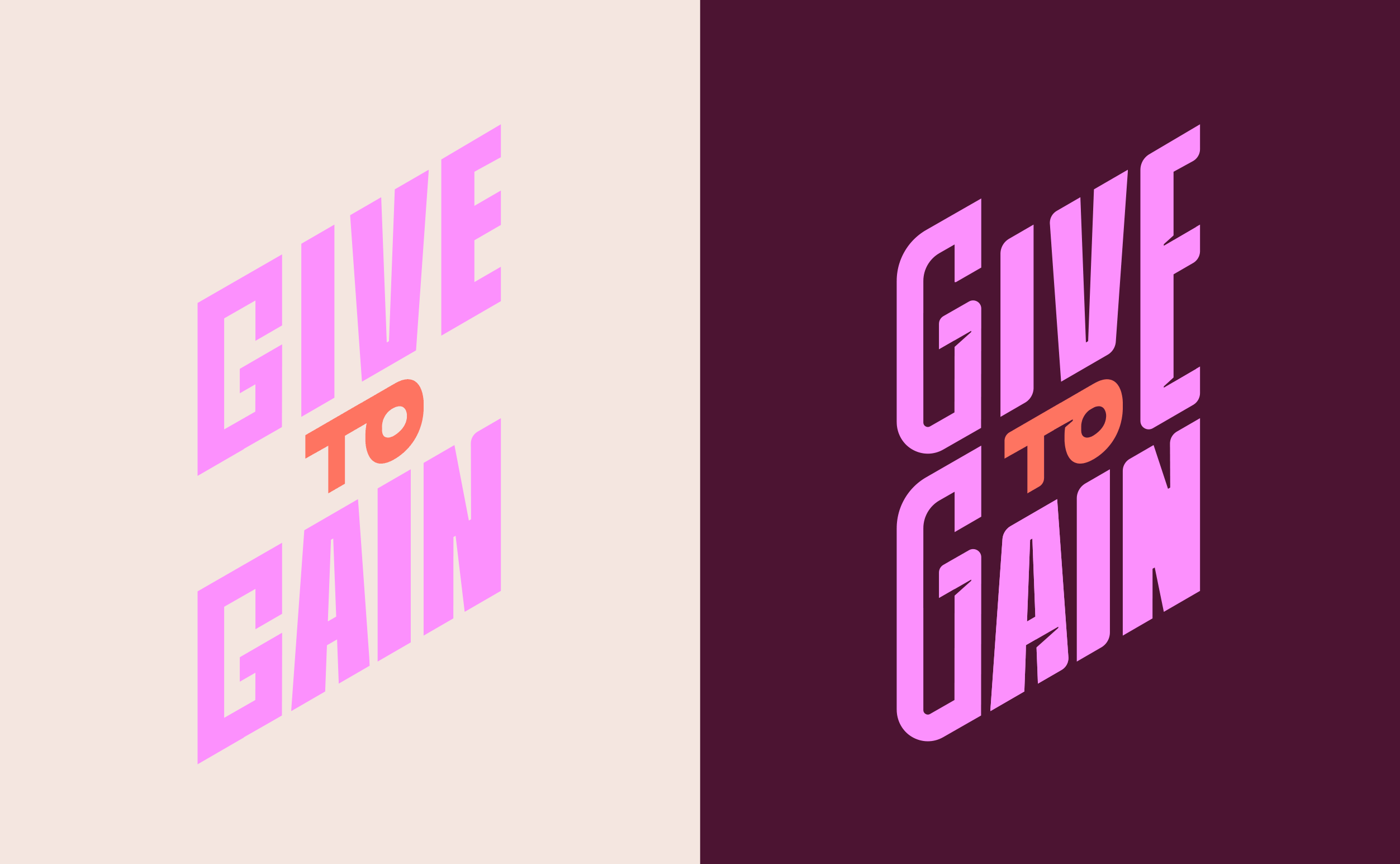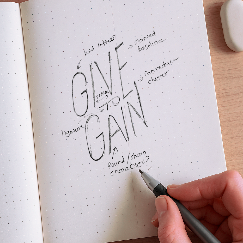 The main words "GIVE" and "GAIN" feature a bold, and impactful letter style complemented by graceful curves. The stylised cuts in the letters add sharp personality to the characters. This angular, ascending structure of the letters inherently suggests growth and progress, reflecting a journey of advancement. The surrounding graphic elements are metaphors for the various aspects of a woman's journey and growth. To bring a deeper connection to women and their diverse personalities, I have integrated textures inspired by women's clothing into the letters.
